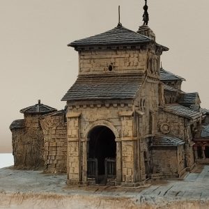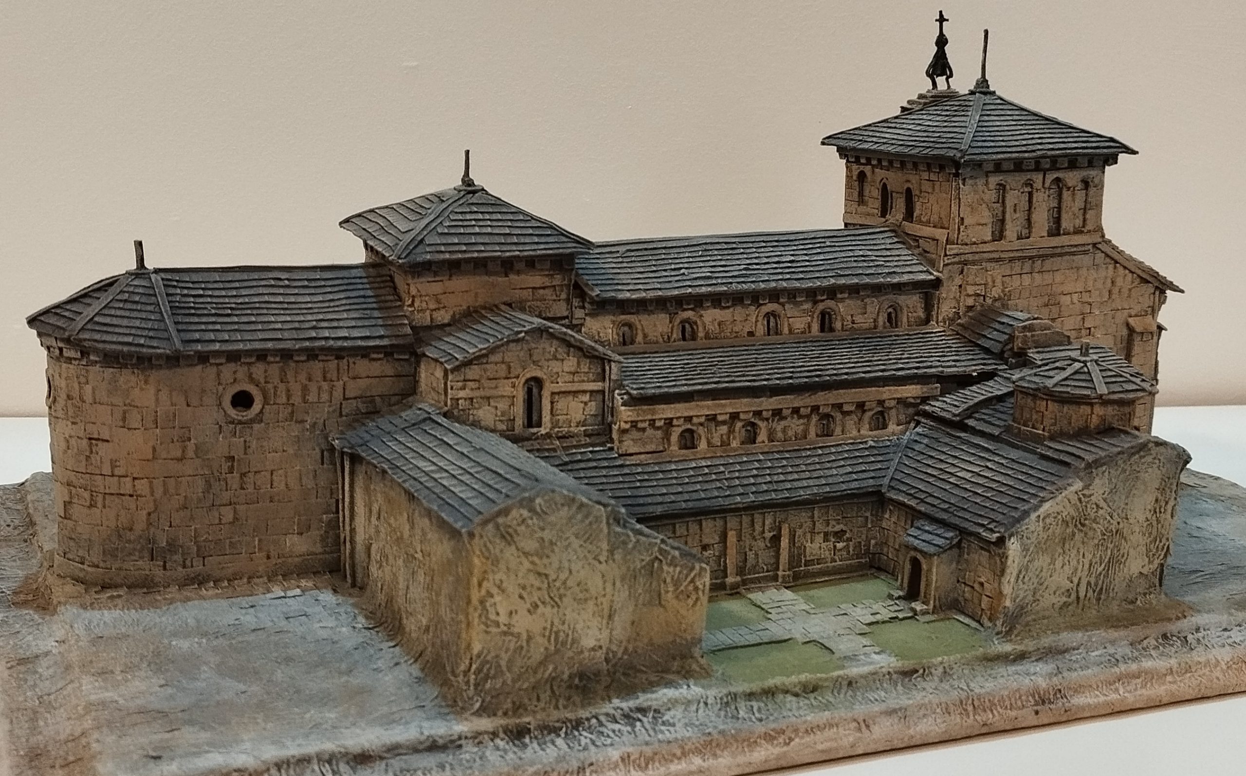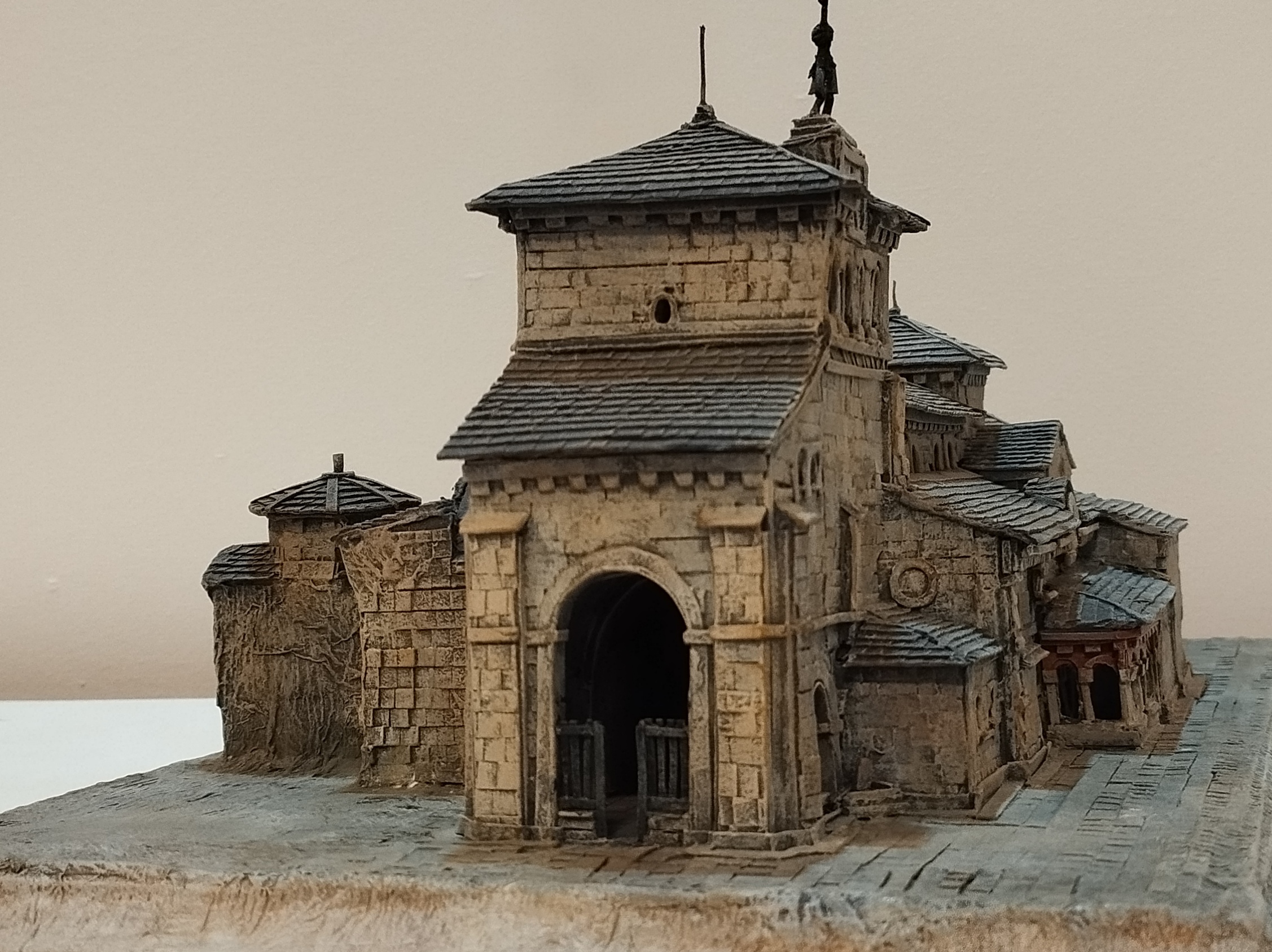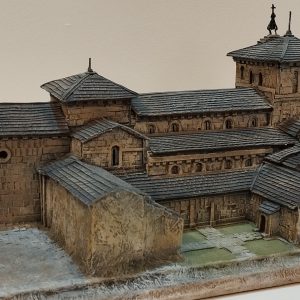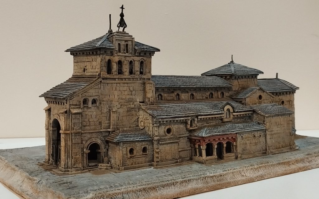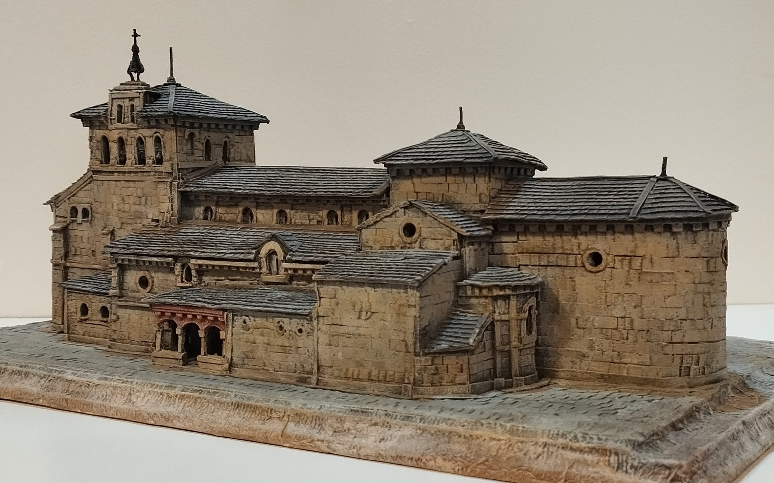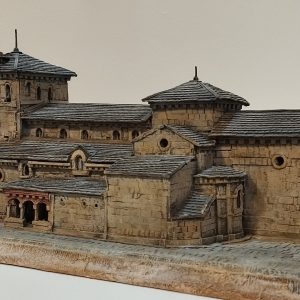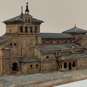 Esta maqueta ha sido concebida para poner en valor las proporciones equilibradas y los volúmenes característicos de la Catedral de San Pedro. Se ha prestado especial atención a la lectura del alzado principal, la relación entre naves y el tratamiento de los elementos ornamentales románicos. El modelo transmite la presencia serena y la lógica constructiva del edificio, invitando a apreciar la monumentalidad que distingue a esta catedral dentro del paisaje jacobeo aragonés.