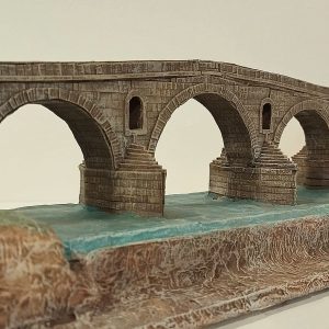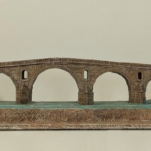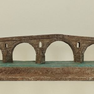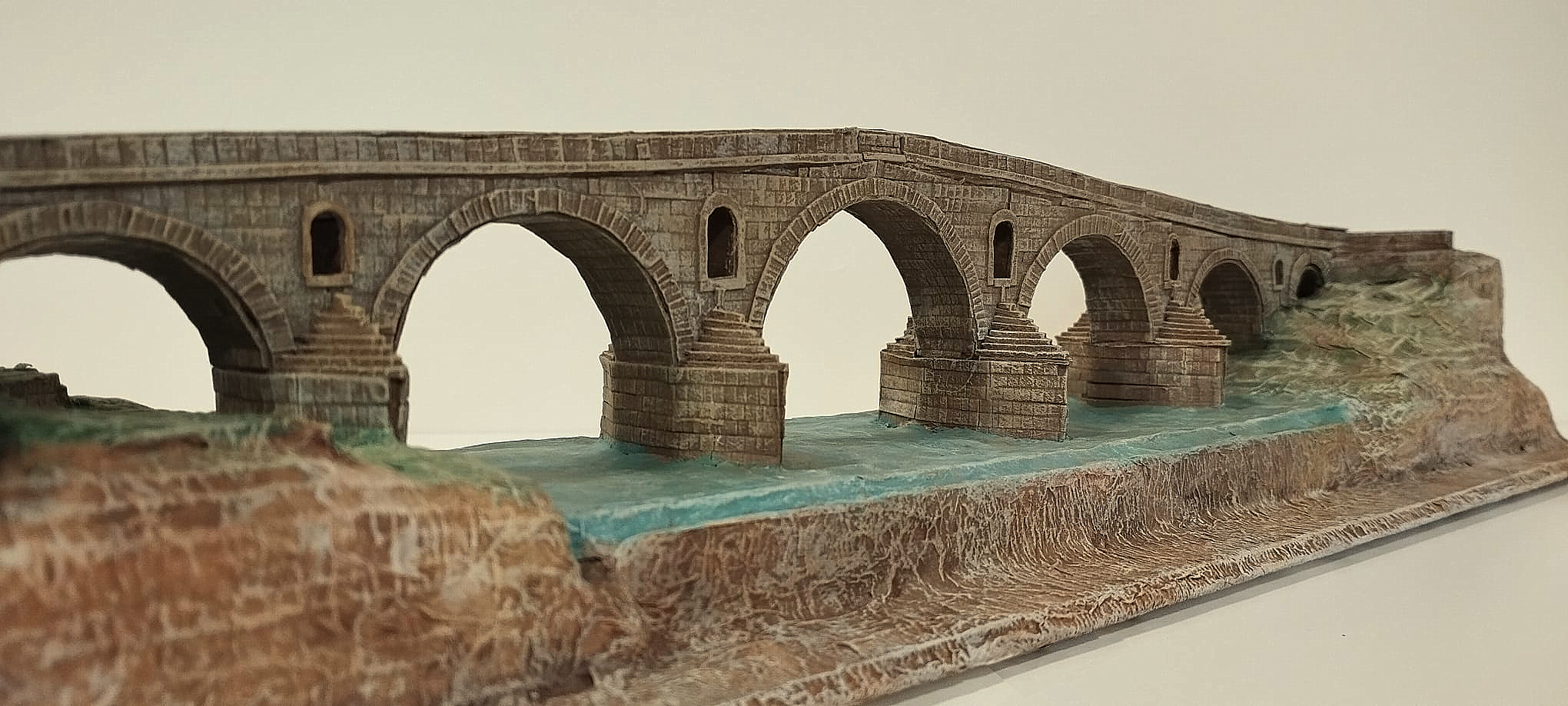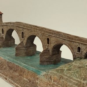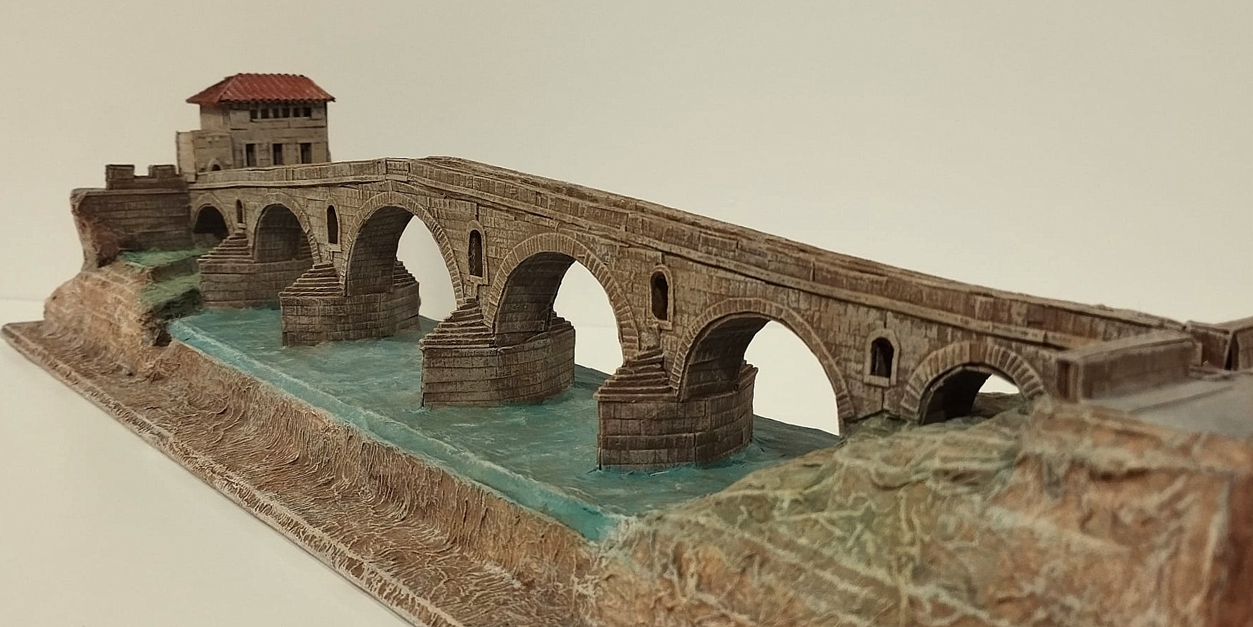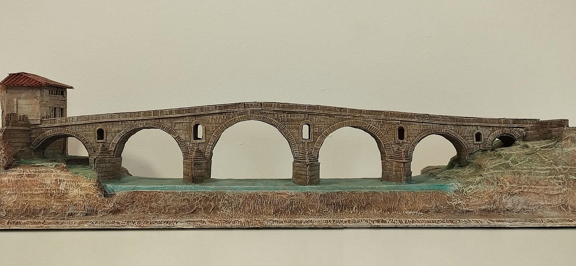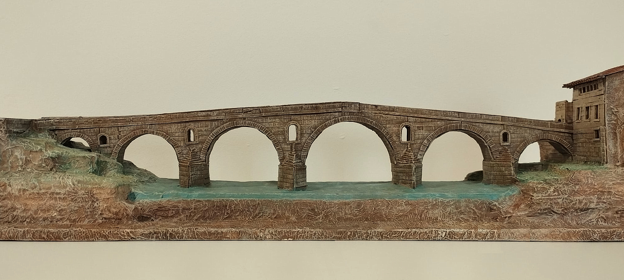 Esta maqueta busca mostrar el carácter singular de este monumento excepcional, con su largo trazado y su singular esbeltez. Se ha trabajado considerando la impresión que causa al peregrino, tanto a su paso como en la visión desde ambas orillas.